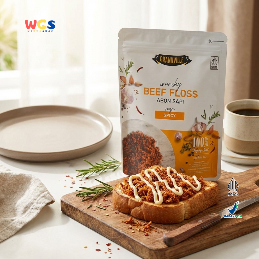 Grandville Crunchy Beef Floss Abon Sapi Spicy adalah abon sapi premium dengan rasa pedas gurih yang kaya rempah. Dibuat dari "100% daging sapi berkualitas" dan diproses hingga menghasilkan tekstur "crunchy, ringan, dan lezat".