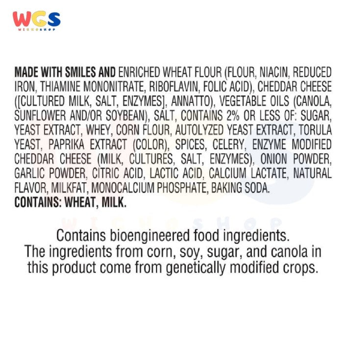 Made With Smiles And Enriched Wheat Flour (Flour, Niacin, Reduced Iron, Thiamine Mononitrate, Riboflavin, Folic Acid), Cheddar Cheese ([Cultured Milk, Salt, Enzymes], Annatto), Canola And/Or Sunflower Oil, Salt, Contains 2% Or Less Of: Sugar, Yeast Extract, Whey, Corn Flour, Autolyzed Yeast Extract, Torula Yeast, Paprika Extract (Color), Spices, Celery, Enzyme Modified Cheddar Cheese (Milk, Cultures, Salt, Enzymes), Onion Powder, Garlic Powder, Citric Acid, Lactic Acid, Calcium Lactate, Natural Flavor, Milkfat, Monocalcium Phosphate, Baking Soda. Contains: Wheat, Milk.