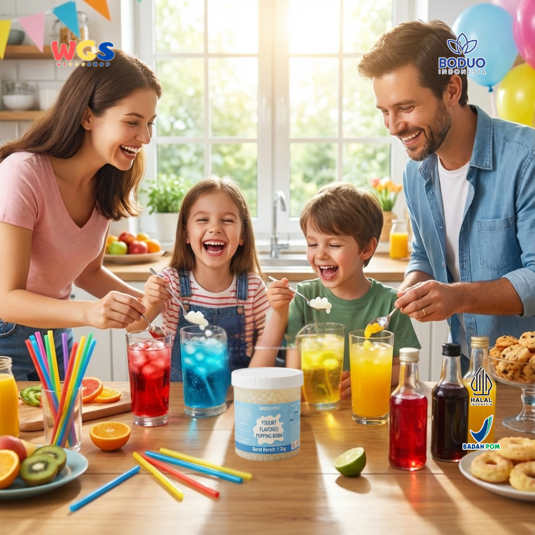 Tekstur kulit boba yang elastis dan tipis membuat isian yogurt terasa maksimal, sehingga cocok menjadi pelengkap berbagai minuman kekinian seperti fruit tea, milk tea, yogurt drink, mocktail, hingga dessert bowl. Popping boba siap digunakan tanpa proses memasak, sehingga lebih praktis dan efisien untuk kebutuhan rumah maupun usaha minuman.