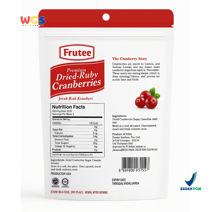 Dikemas dalam pouch ziplock yang dapat ditutup kembali, Frutee Dried Ruby Cranberries sangat cocok untuk dinikmati kapan saja, baik sebagai camilan langsung, tambahan salad buah, topping untuk yogurt, atau bahan campuran dalam kue dan roti.