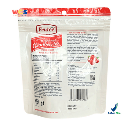 Frutee Dried Ruby Cranberries adalah camilan buah cranberry kering premium yang diolah dari buah cranberry pilihan berkualitas tinggi asal Amerika Serikat. Dikeringkan secara sempurna untuk mempertahankan rasa manis alami dan tekstur lembut yang menggoda, produk ini adalah pilihan sehat yang lezat dan praktis.
