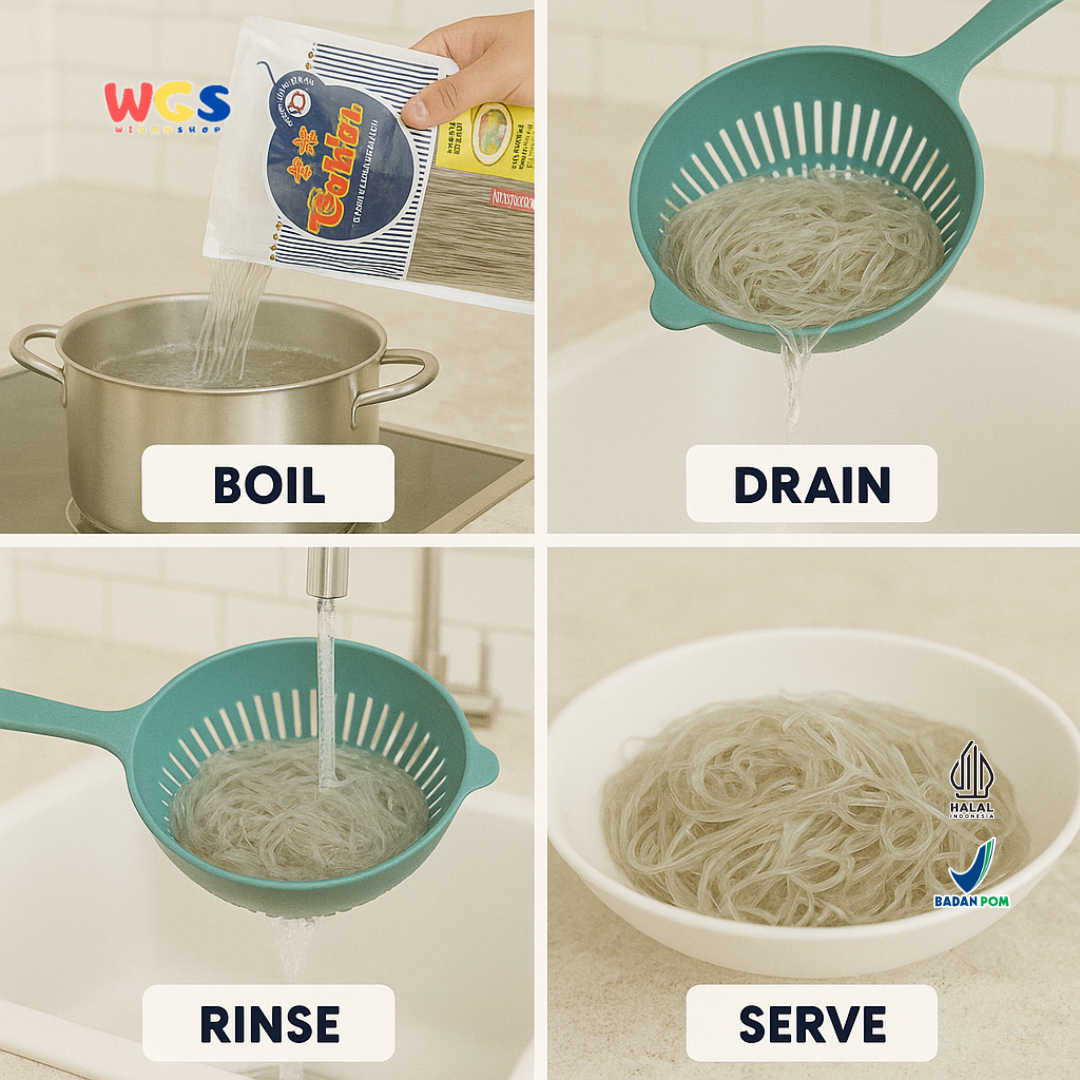 1. Persiapan dasar: Rebus air banyak. Masak bihun 6–8 menit hingga kenyal-transparan. Tiriskan, bilas air mengalir/air es. Aduk 1 sdt minyak (opsional). Tip: untuk lebih chewy, rebus 5–6 menit lalu selesai dimasak di wajan/kuah.